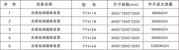 工作原理 FT411~FT414系列雜物檢測剔除裝置用于煙草工業(yè)的打葉復烤和制絲生產線的煙葉除雜,該裝置主要由進料輸送機、食品柜、氣流平衡柜、電控系統(tǒng)等四個主要部件組成。這四個組件協(xié)調工作,對葉片進行攤薄,對其中的雜物進行識別、分揀、剔除。整體用不銹鋼制造,易于清潔、保養(yǎng)。 葉片通過特殊振槽/攤薄機等輔連設備,形成均勻薄層,使雜物盡量不夾雜于葉片中間.輸送機將葉片薄層加速通過特殊振槽/攤薄機等輔連設備,形成均勻薄層,使雜物盡量不夾雜于葉片中間.輸送機將葉片薄層加速通過視頻系統(tǒng),高速線陣CCD相機拍攝葉片圖像/送入嵌入式FPGA+DSP圖像處理硬件平臺,通過獨創(chuàng)新一代多維度圖像算法的處理,綜合雜物顏色、形狀、紋理等特征參數(shù),識別出雜物,并計算雜物在輸送機末端的相對坐標,進而發(fā)出指令,控制相應坐標的高速氣動電磁閥,將雜物剔除。 規(guī)格型號